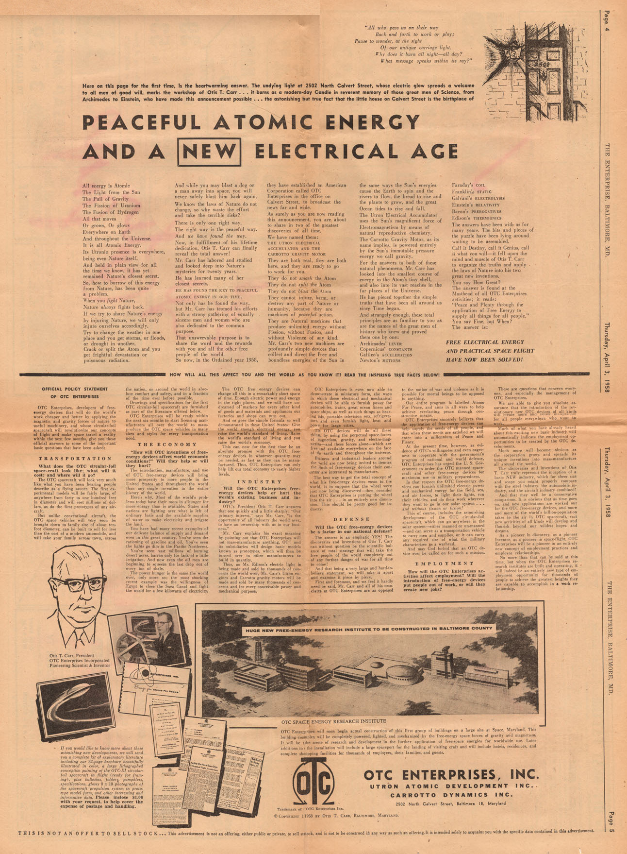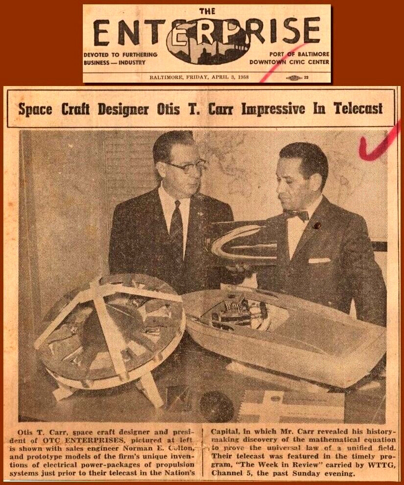 Later that month, on March 30, 1958, Otis T. Carr appeared with Norman Colton on Washington, D.C., station WTTG’s program, “The Week in Review.” They displayed models of Carr’s inventions and told about how they would revolutionize technology and facilitate space travel. On April 3rd, The Enterprise, a Baltimore weekly tabloid newspaper carried a front-page photo from the show with the headline, “Space Craft Designer Otis T. Carr Impressive in Telecast.” Also, in a somewhat related article, Carr talked about “the Revelation of the Easter Message,” saying that his Utron Electrical Accumulator was based on the secret hidden in the form of Christ’s cross. The paper also featured a two-page spread advertisement for OTC Enterprises, which explained how they would transform: transportation, the economy, industry defense and employment. It would affect our daily lives; in effect, OTC said they could put a saucer in every garage: