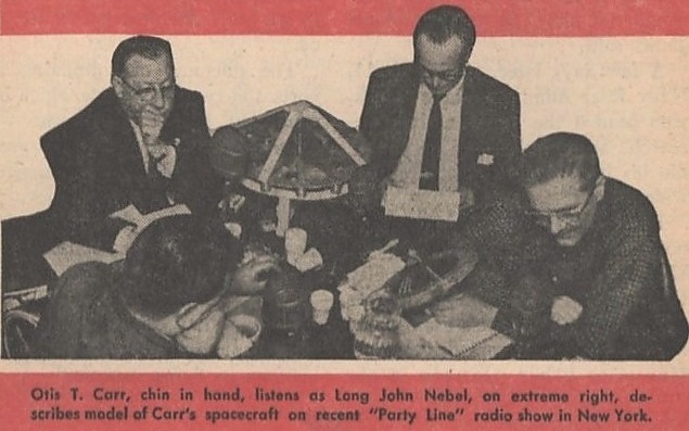 “It was the upturn point in his fortune.” That’s how Bud Gosnell described Carr’s debut on Long John Nebel’s radio show. Though Nebel and his panelists frequently challenged the claims of “crackpots,” the exposure they provided served to boost a lot of careers. Carr and Norman Colton packed up their saucer models and traveled to New York to appear on Nebel’s Party Line on April 19, 1958. It was broadcast on station WOR which had a signal powerful enough to reach half the USA and a fair chunk of Canada as well.