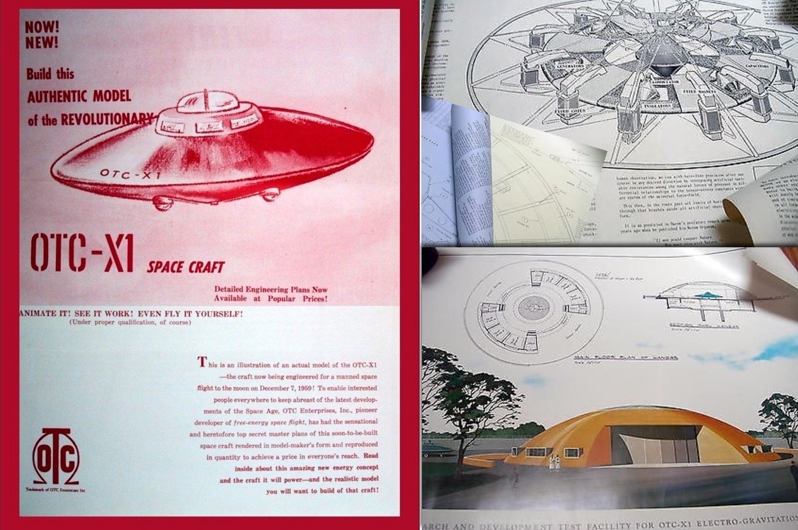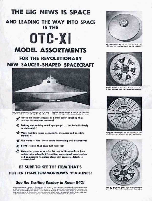 Otis T. Carr began marketing the company’s first physical product in October, a set of model plans for the “OTC-X1 Space Craft” sold at $5, two for $9, or three for $12. The 17’ x 22” color plans were mailed in a tube and could double as decorative posters. In connection with this product, Carr had his concepts copyrighted, not patented: the Carrotto Gravity Motor, the Utron Electric Battery/Utron electrical accumulator, and the OTC-X1 space craft, all © 1958.