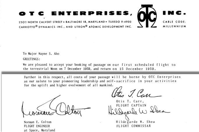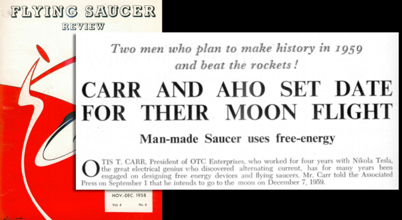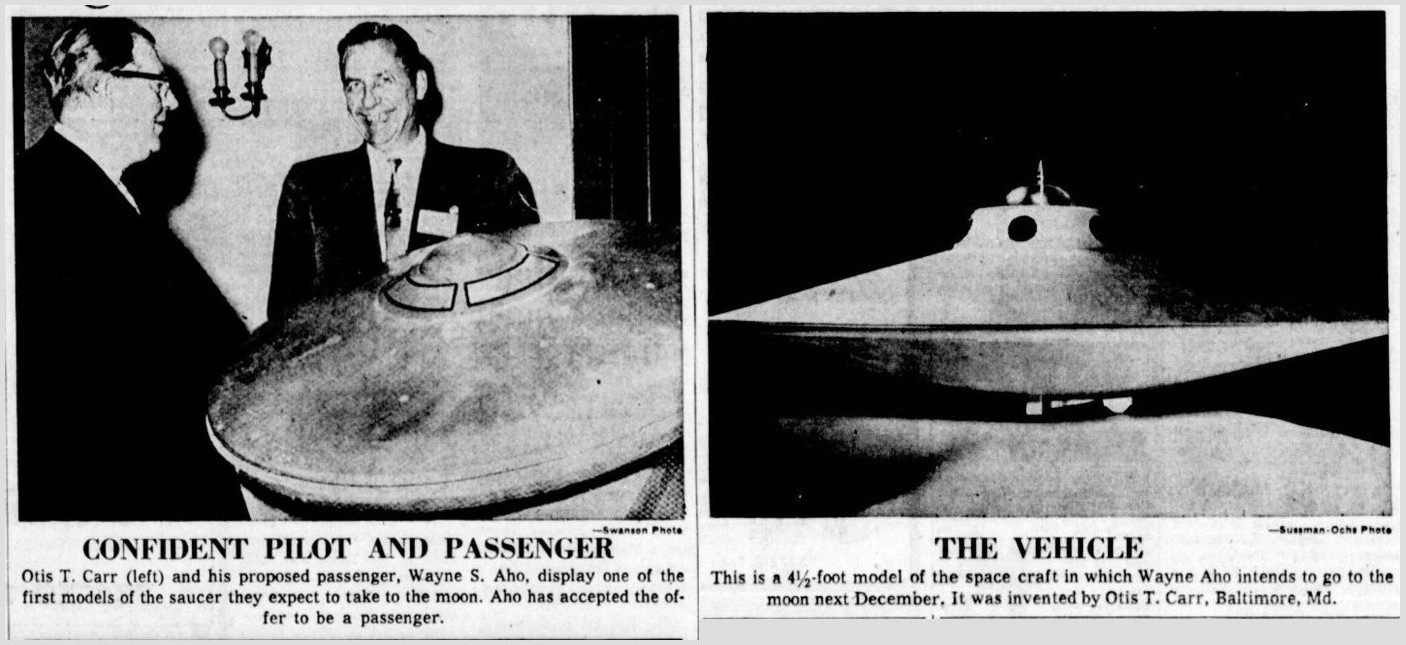 Wayne Aho was skilled at working the saucer convention and lecture circuit, and more importantly, the press. He had just wrapped up several months in a successful lecture tour partnership endorsing Reinhold O. Schmidt, the new Contactee who’d met the people from Saturn. Carr recognized Aho’s value and brought him into the OTC team. Carr always brought along a model of his saucer and the Utron as a visual aid to wow the crowd, but with Aho he had a good lecture partner and a living stage prop. At their first event together, Carr announced that Maj. Aho would join him on a flight to the moon set for Dec. 7, 1959.