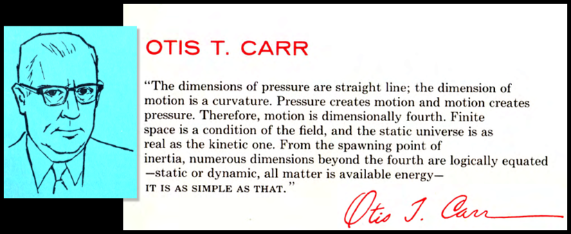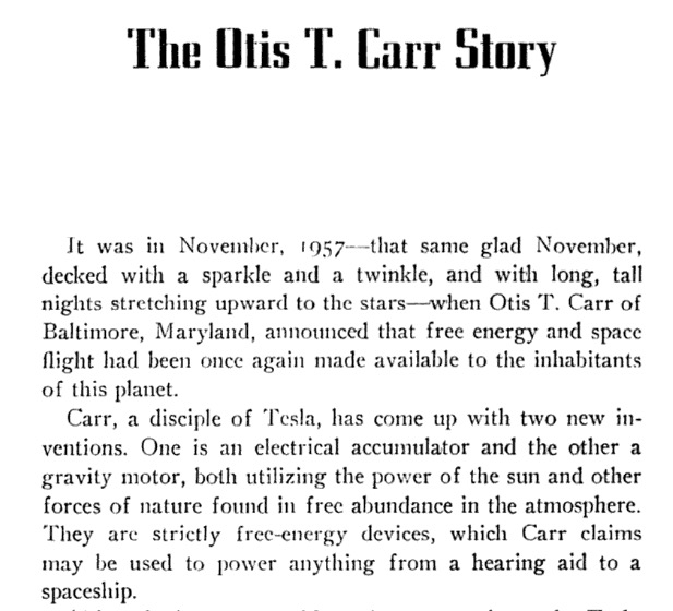 Storm’s chapter, “The Otis T. Carr Story,” explained that while Otis was not a Contactee, it was safe to assume that the space people had been carefully watching his work, and that, “Tesla and the Dove have assuredly directed it from the scientific department of Shamballa, making certain that it will fit into the Divine Plan at exactly the right moment.”