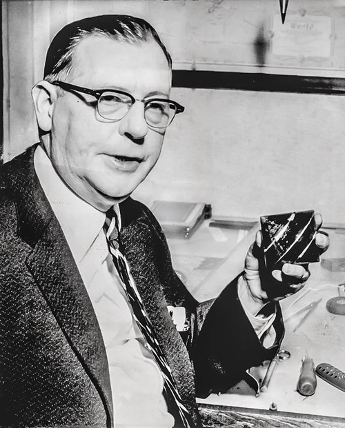 Carr holding Utron Electric Accumulator, 1957.