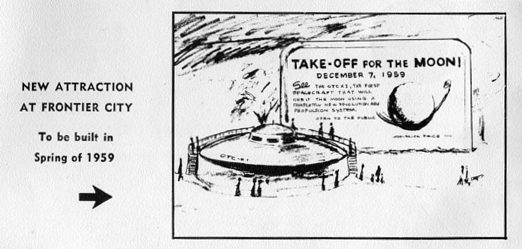 Carr’s contract with James C. Burge for the OTC-X1 space ship ride at Frontier City, U.S.A. was taking shape, and information about it appeared in the park’s promotional material and in the media. “Frontier City Due Expansion” was the headline for the story in The Daily Oklahoman, Oklahoma City, Nov. 23, 1958. “Twenty-six new rides and concessions… will be installed at Frontier City, U.S.A., now undergoing an $800,000 expansion program… There will be room for 35 passengers in the cabin of an aluminum ‘saucer’ which is the exact model of a space ship, now being designed by Otis T. Carr, Maryland scientist, for his proposed trip to the moon in December 1959. The outside shell of the ‘saucer’ will orbit counter-clockwise and the inside, clock-wise. Passengers will get the effect of floating through space by a hydraulic lift. Inner workings of the space ship can be seen by passengers through a plexiglass window. A lecture prepared by Mr. Carr will be tape recorded and played each time to explain the project to the visitors. Frontier City has the exclusive rights to the cable car and spaceship rides for one year.” Carr’s ride would complete the illusion of space flight with “an animated movie of heavenly bodies above the passengers to give the passengers an impression of leaving the earth and approaching a distant planet…” The spaceship ride might stand on its own, but its design and promotion were tied to the successful flight of Otis T. Carr’s saucer to the moon.