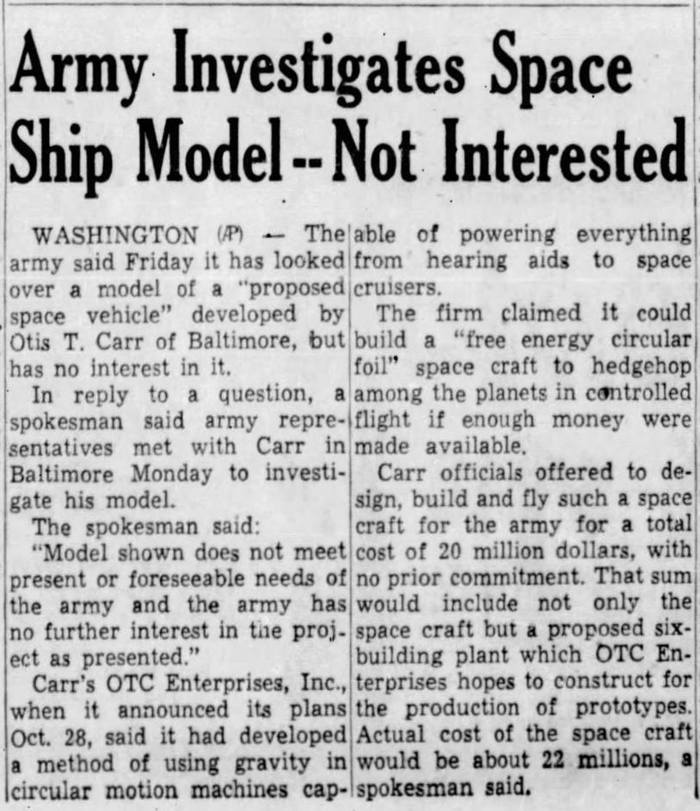 Barker published a follow-up in Saucerian Bulletin, Vol 3, No. 3, June 15, 1958, “Late Report on Otis T. Carr.” Barker had Eugene Villagret investigate OTC Enterprises, Inc. in Baltimore. Villagret had been given a tour of their offices, including Carr’s workshop on the top floor. In his meeting with Norman E. Colton, he was told that the US government rejected Carr’s free energy saucer because they were protecting “vested interests,” the oil and automotive industries. Colton mentioned OTC’s forthcoming stock offering, which he said would be preceded by a public demonstration of the space ship.