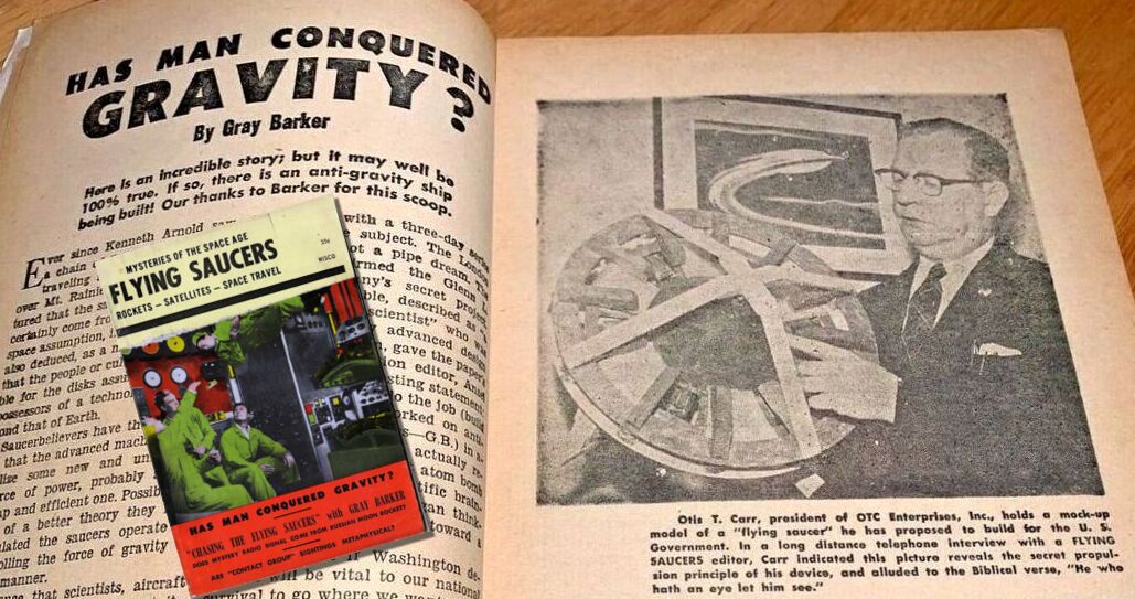 Following Carr’s appearance on the Party Line, he began to get more attention. Gray Barker published his interview with Otis T. Carr in Saucerian Bulletin, May 1, 1958, later expanded as four-page article, “Has Man Conquered Gravity?” for the Flying Saucers July – August issue. Carr said that the press photos showing the interior of the OTC-X1 model revealed the secret propulsion principle of the device, and enigmatically alluded to the Biblical verse, “He who hath an eye let him see.” Barker wrote, “[Carr] believes in Flying Saucers… they may come either from space or some unknown source on the Earth. He offered certain information to the Government in 1949, feels actual development from that information could have been made by Uncle Sam… some saucers could be ‘electrical life’ created in atomic explosions.”