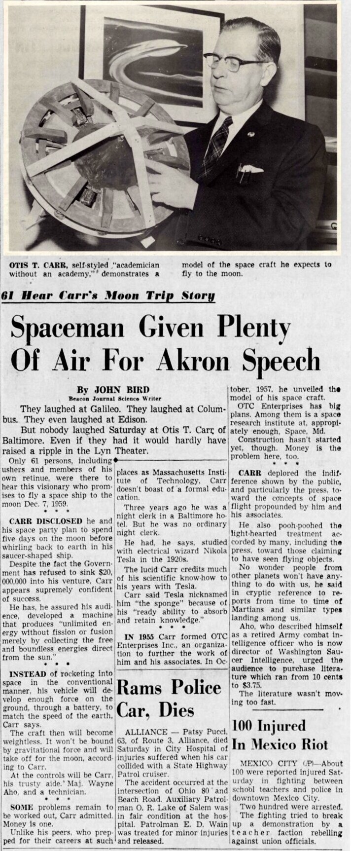 In his marketing of OTC Enterprises, Norman Colton downplayed Carr’s occult side and pitched the message as more conventional, about science, industry, and progress. However, Carr spent most of the end of 1958 lecturing with Wayne Aho for Units of Contactee Dan Fry’s spiritually themed flying saucer organization, Understanding, Inc. While on tour they were photographed for the Tucson Daily Citizen, Dec. 5, 1958, “Uneasy Over Trip To Moon? Not Flying Saucer Man Aho” by Jack Carson. Aho stated, “I hope that by this trip we can do something to bring a peaceful space age into being.”