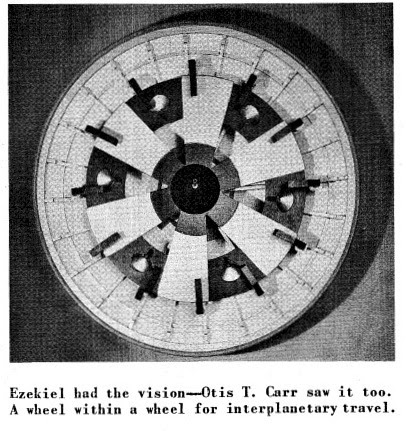 Following the publication of the OTC brochure, a press conference was held on Oct. 28, 1957, and as hoped, it put Carr’s name in the papers. The Associated Press story on Carr was distributed nationally, carried in some newspapers as front-page news. The Independent from Long Beach, CA, ran the headline, “Invents Space ‘Saucer,’” but most papers used Carr’s preferred term, “Circular Foil Craft” to describe the form of his planned spaceship. The OTC-X1’s anti-gravity propulsion was supposed to be generated by the counter-rotating forces of the “wheel within a wheel” of the saucer. In his literature, Carr explained that: