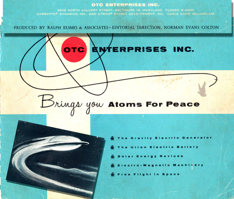 Carr had been tinkering with saucer concepts since at least 1952 but had attracted only a few local supporters. Colton took Carr’s ideas and made them sing, packaging them into a colorful spiral-bound pamphlet, published in October 1957, “OTCEnterprises, Inc, Brings You Atoms For Peace.” Long John Nebel later described it as “thirty-two beautiful pages rife with elaborate diagrams, graphs and renderings, including a 40” × 8” foldout… that ranks with the best that Madison Avenue has to offer…” It was available to anyone for $1 “to help cover the expense of postage and handling.” It carried the slogan: “Peace and plenty through the application of free energy to supply all things for all people.” Two subsidiaries were listed, Carrotto Dynamics, Inc. and Utron Atomic Development, Inc.