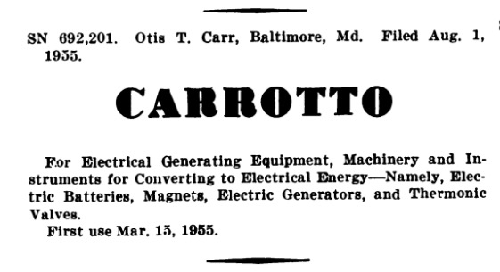 The flying saucer portion of Otis T. Carr’s life that can be documented really begins in 1955 with his registration for an invention. Carr filed a trademark on Aug. 1, 1955, for the name “Carrotto,” with the United States Patent Office. It was within the listings for “Electrical Apparatus, Machines and Supplies.” Carr secured a trademark, but not a patent. At that time, Carr worked for the Southern Hotel in Baltimore, managed by Harold I. Fink, who said he was employed there as a room clerk from Dec. 16, 1942, to Dec. 20, 1955, at a salary around $250 a month. “Mr. Carr was very irresponsible and would hit the bottle quite frequently… he would imagine that he was a great scientist and inventor. The last time he was on a drunk, he was fired, and the next day he invented a space ship…” According to documents, Carr incorporated OTC Enterprises in 1955 and began selling stock, based on plans for the company to manufacture a “free energy” generator that would power a spaceship. Carr’s story reached the public in late 1957, just weeks after the news of Sputnik, the earth’s first space satellite.